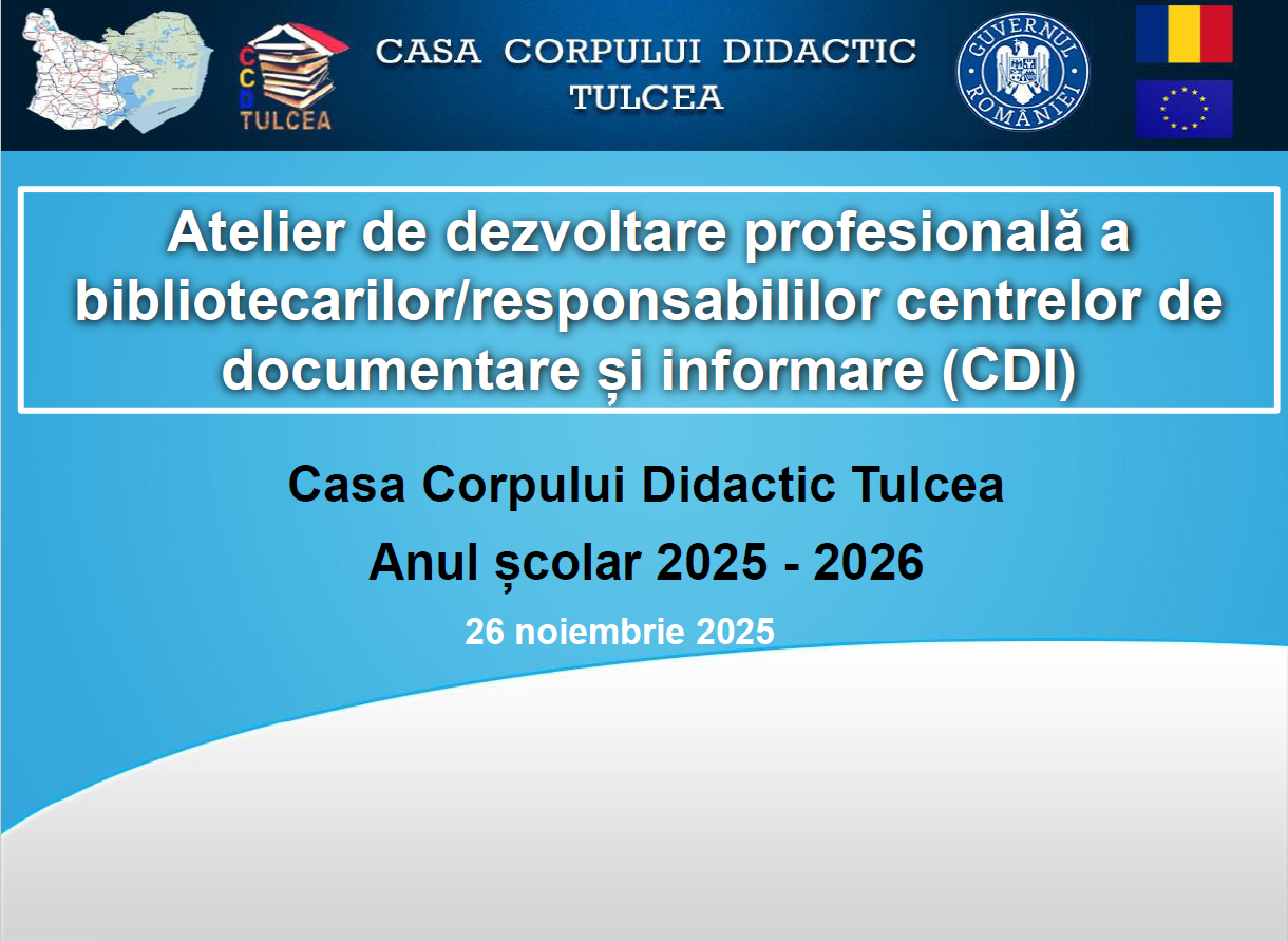 Casa Corpului Didactic Tulcea a organizat miercuri, 26 noiembrie 2025, începând cu ora 11.00, primul atelier județean de dezvoltare profesională destinat bibliotecarilor școlari și responsabililor centrelor de documentare și informare (CDI) din unitățile de învățământ din județul Tulcea.