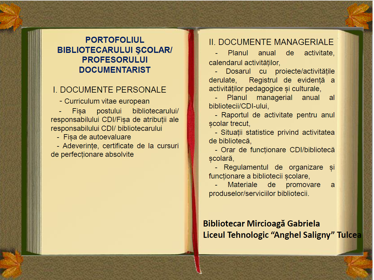 - Portofoliul bibliotecarului/responsabilului CDI – bibliotecar Mircioagă Gabriela, responsabil CDI/bibliotecar Geambașu Veronica Gabriela;