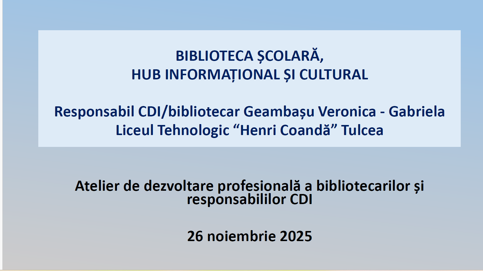 - Repere privind activitatea bibliotecilor școlare/centrelor de documentare și informare (CDI) în anul școlar 2024–2025 și direcții pentru anul școlar 2025–2026 – prof. Mangu Sorina, inspector școlar pentru limba și literatura română, I.S.J. Tulcea; prof. Gabriela Nichifor, director, C.C.D. Tulcea;